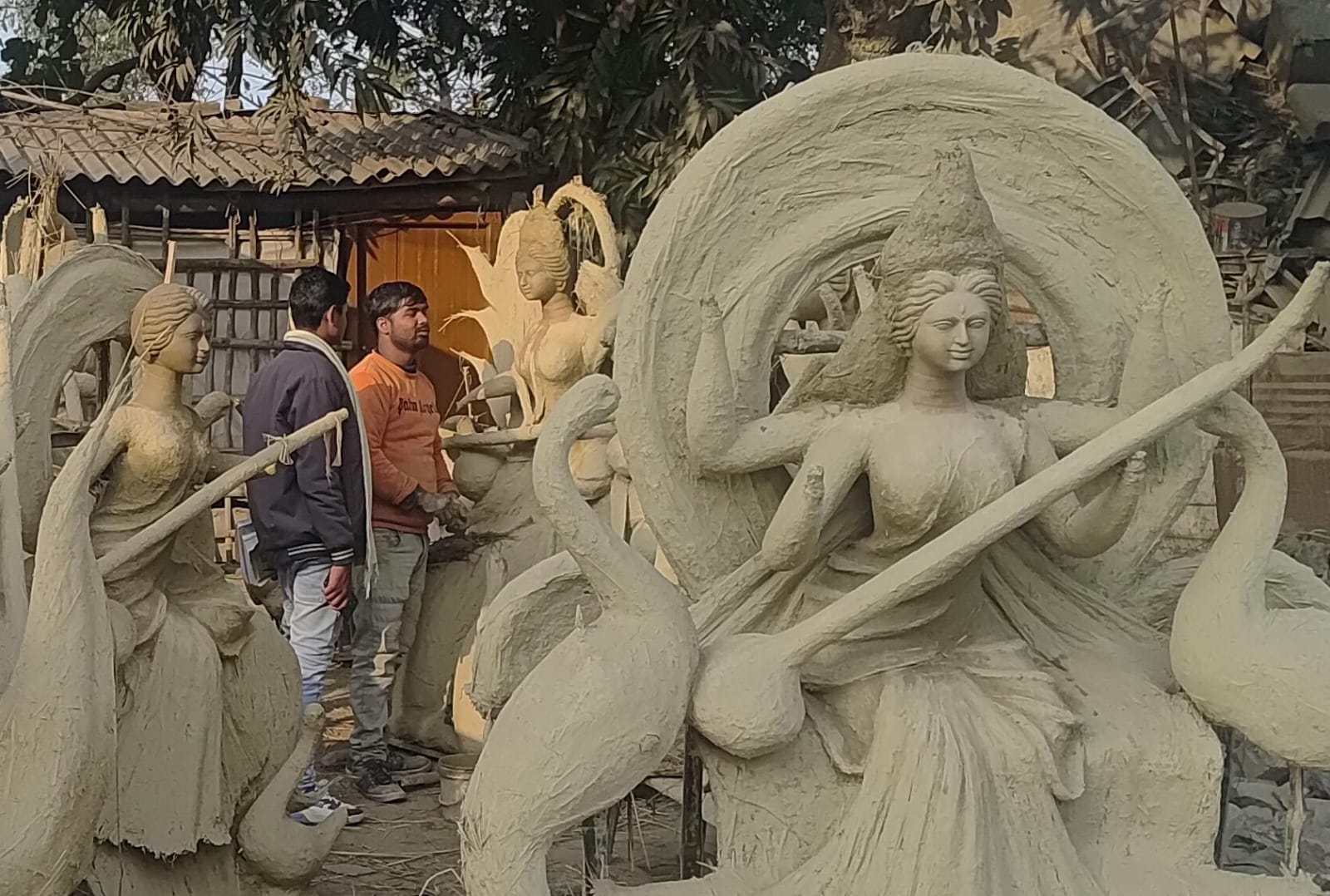 सरस्वती पूजा को लेकर गाँवों में उत्साह चरम पर, मूर्ति निर्माण में जुटे कारीगर।